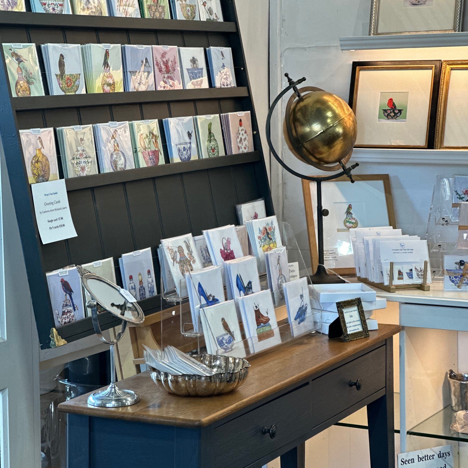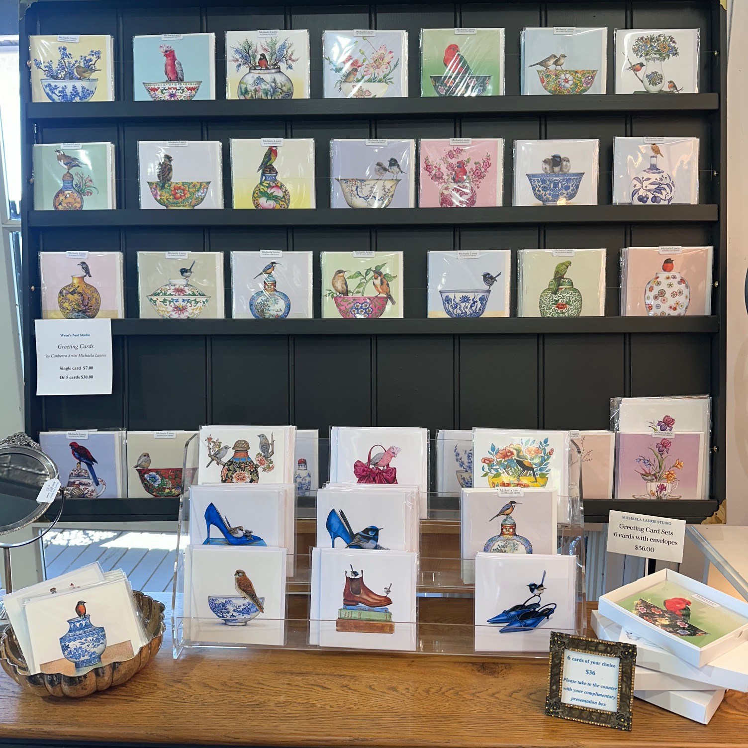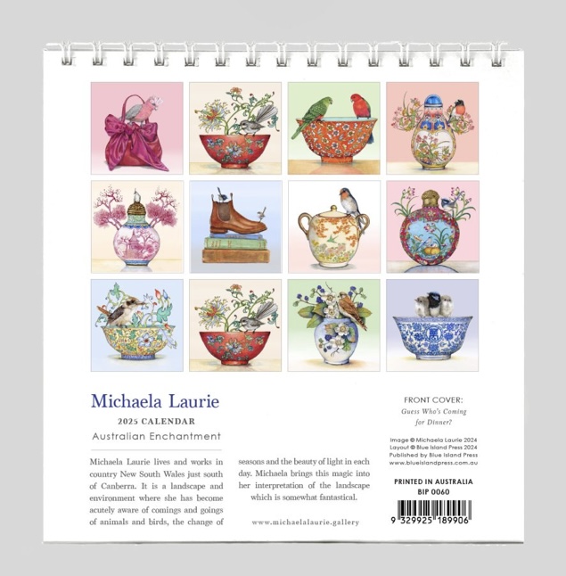 Please visit my Etsy store https://www.etsy.com/au/shop/MichaelaLaurie?ref=seller-platform-mcnav or my shop at Wren’s Nest Studio at Designer Op Shop Emporium 1 Lyall Street, Fyshwick, ACT – Complete range of Blue Island Press published greeting cards + my limited edition seasonal in-house printed cards, card packs, original Miniature Art, my reproduction prints, vintage and antique pieces, contemporary design objects, fine wrapping papers, scarves, cuff links and trinket boxes.