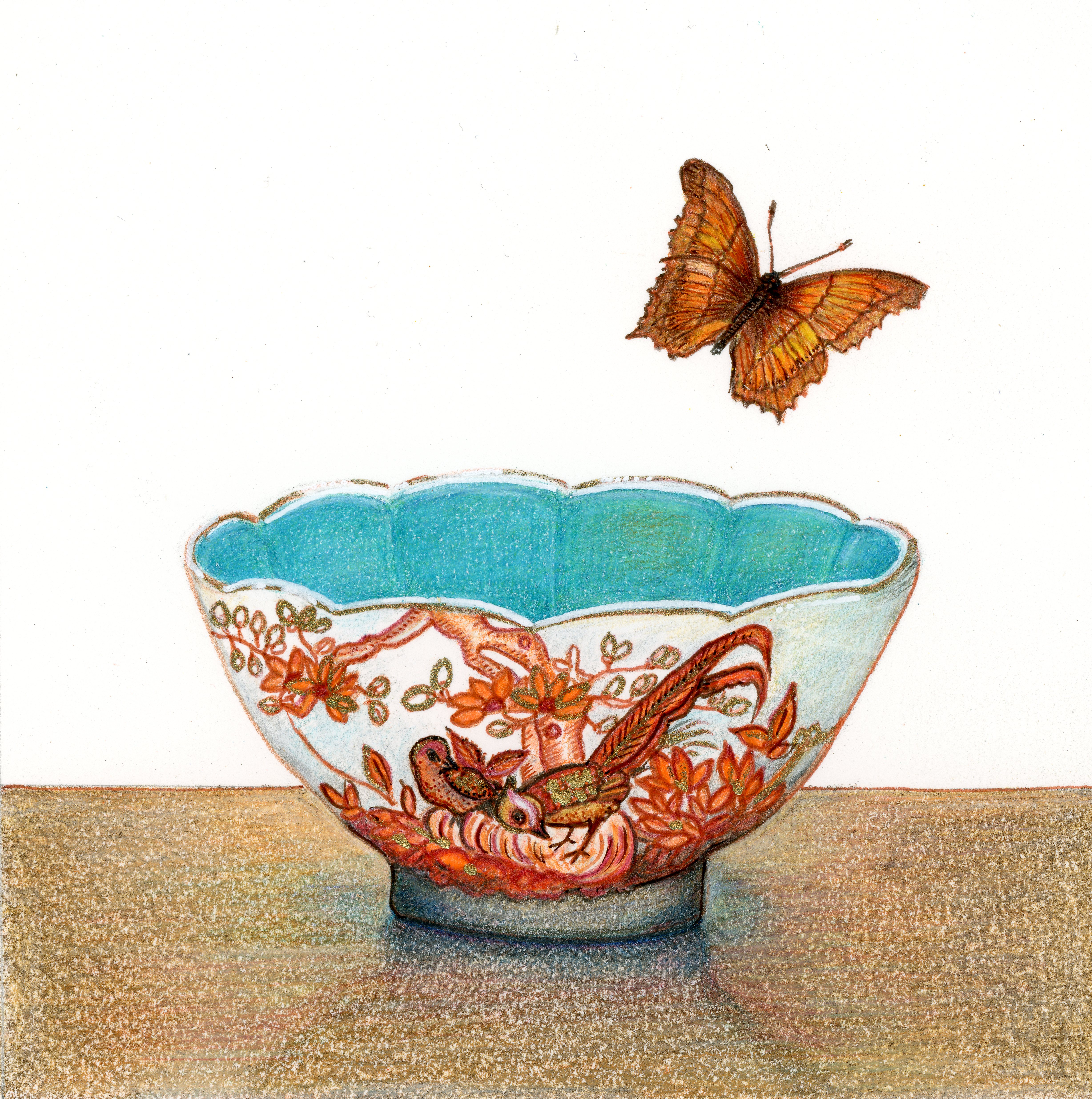 Pretty Bowl with Courting Pheasants and Butterfly. Miniature art 10cm square unframed and 27.5 x 32.5 framed. $300. A charming antique porcelain bowl with turquoise inner glaze, a garden scene with peasants in tangerine and gold and a visiting butterfly. An original mixed media miniature artwork created using pigment ink, coloured pencils and gold ink on Arches watercolour paper. #156