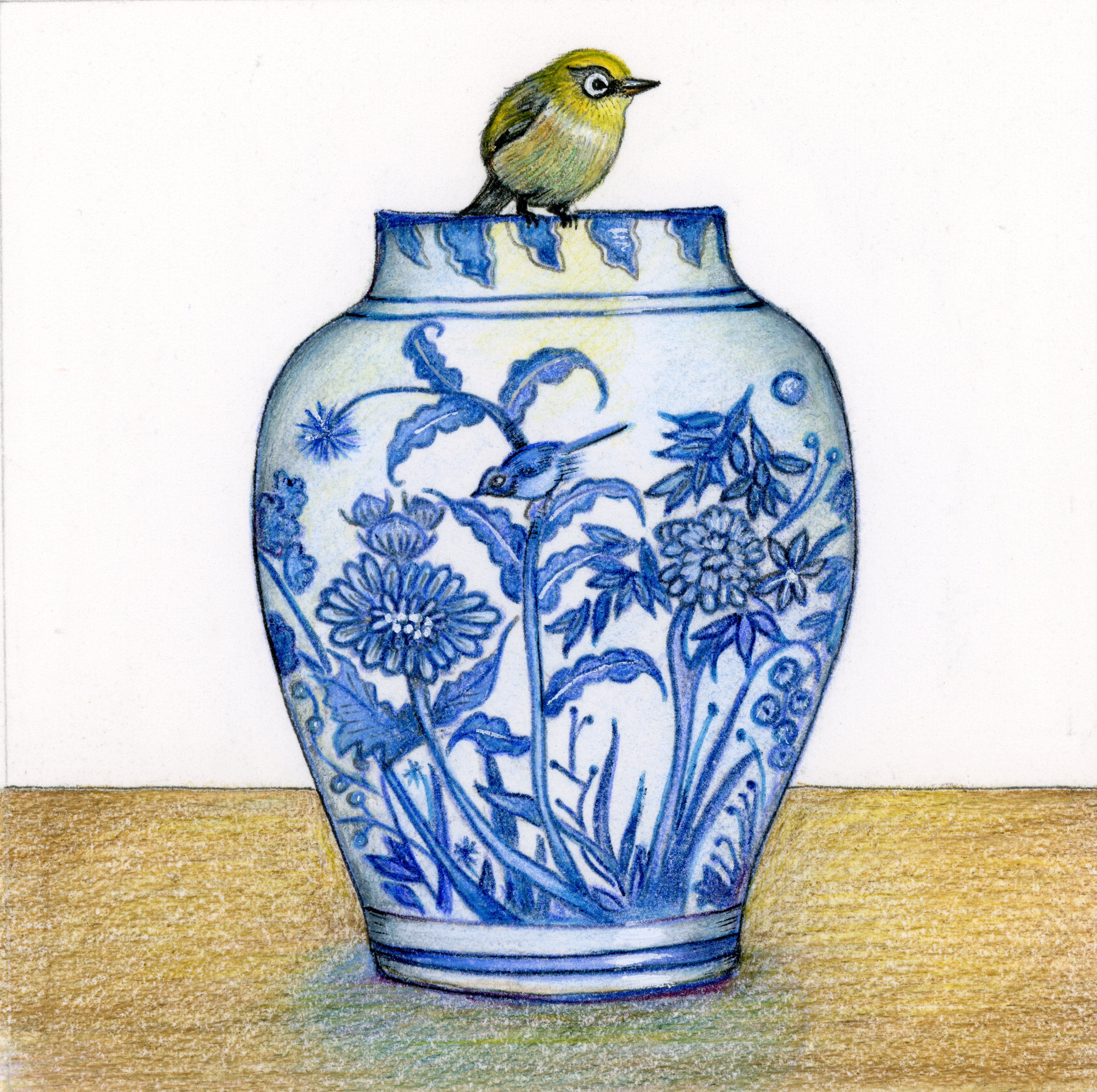 Silver Eye on Blue and White Garden Vase. Miniature art 10cm square unframed. 27 x 32.5 framed. $300. The little Silver Eye bird darts and flits in and out of thick shrubs in our garden. They are regular and welcome visitors. This one has come to rest on a blue and white antique porcelain jar decorated with a pretty garden scene. An original mixed media miniature artwork created using pigment ink and coloured pencils on Arches watercolour paper. #152